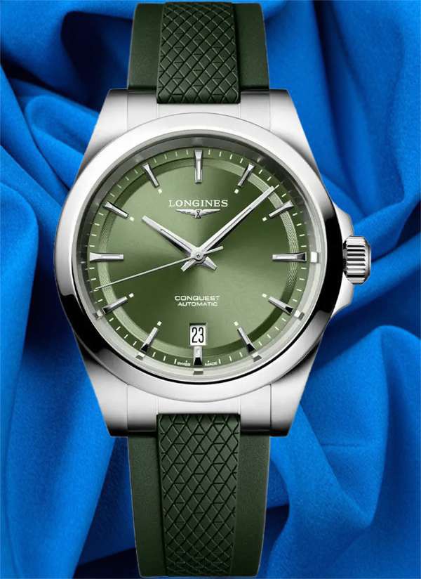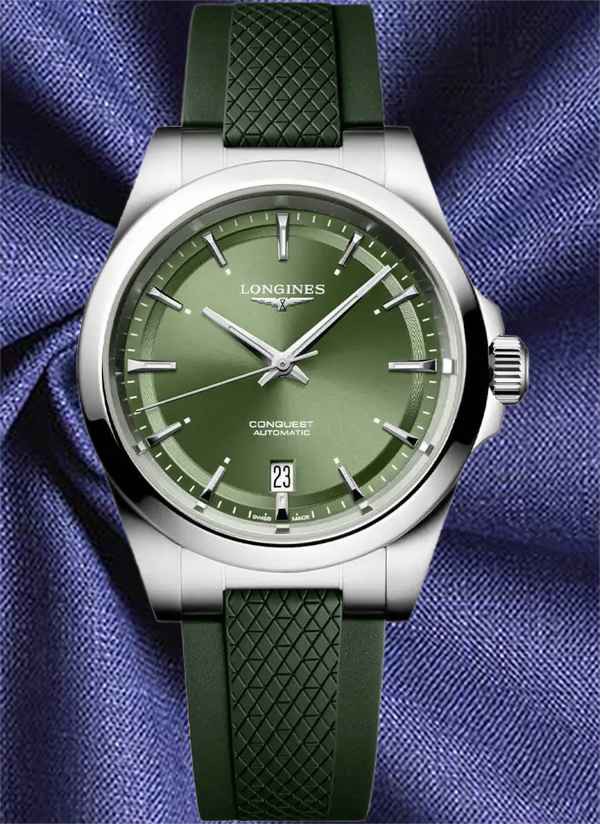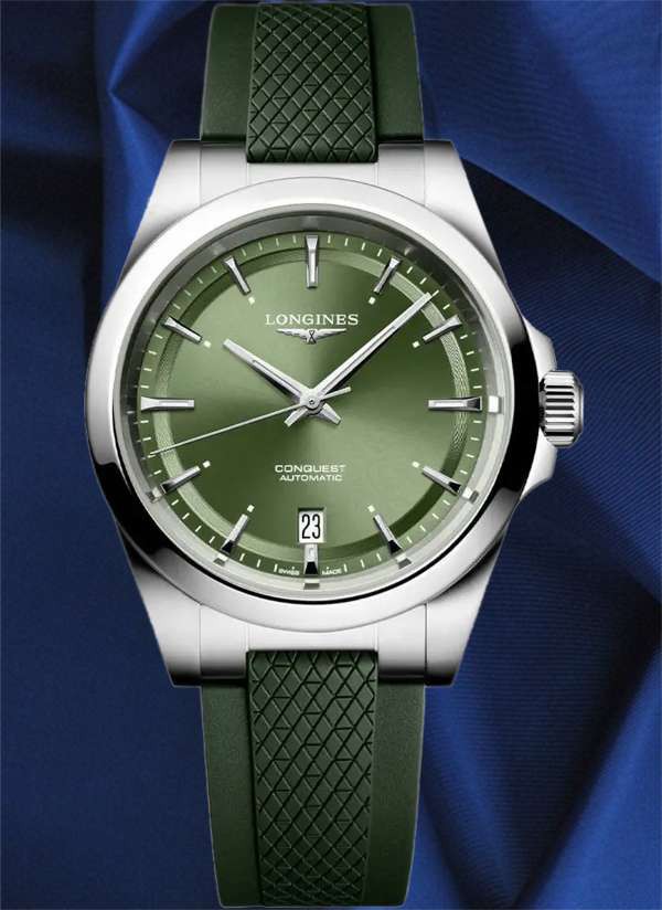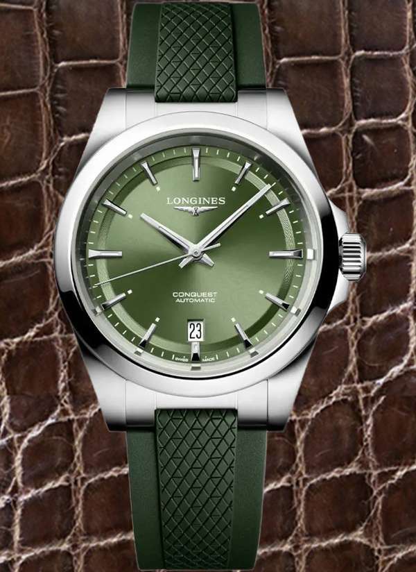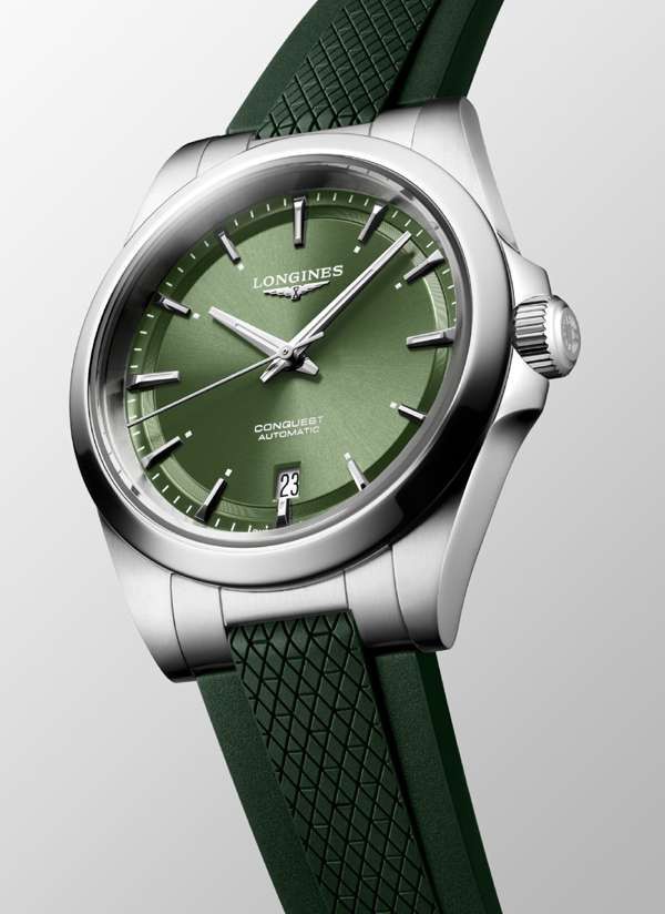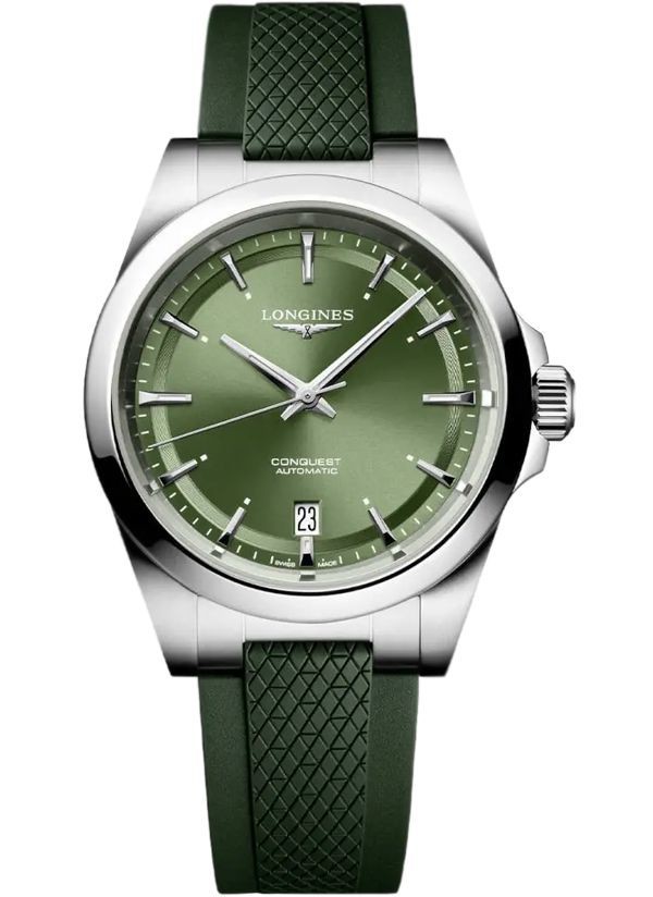 Zegarek Longines Conquest L3.720.4.02.9 zachwyca swoją elegancją, oferując delikatną zieloną tarczę, która nadaje mu wyjątkowy charakter. Zielony kauczukowy pasek dodaje temu modelowi wytrzymałości i nowoczesności, tworząc doskonały balans między stylem, a funkcjonalnością.