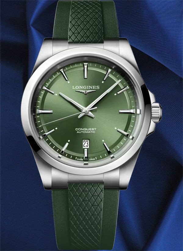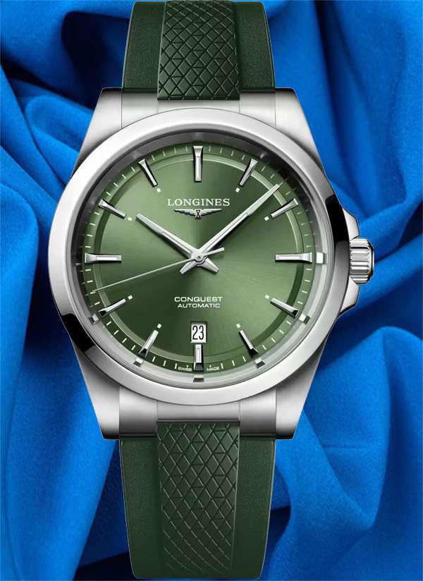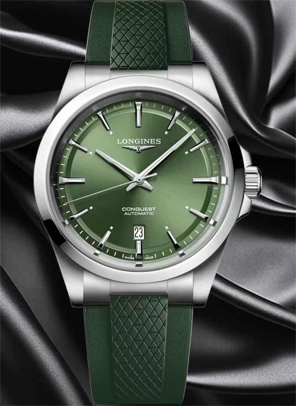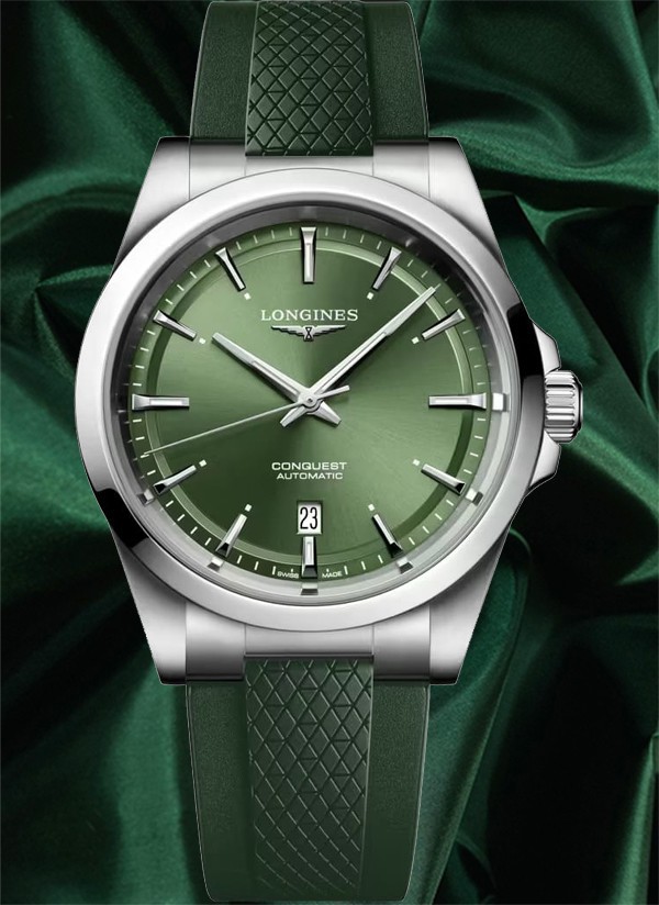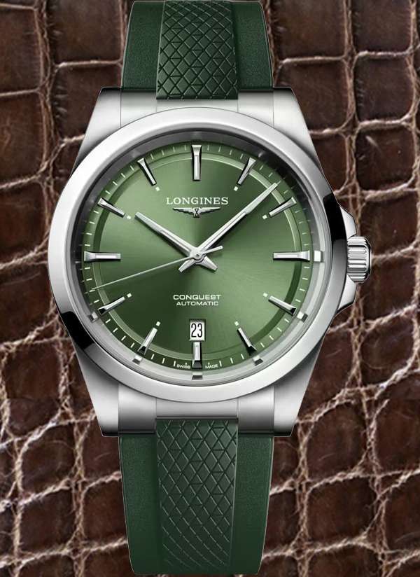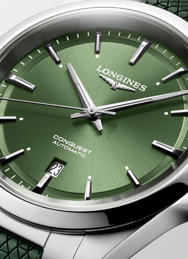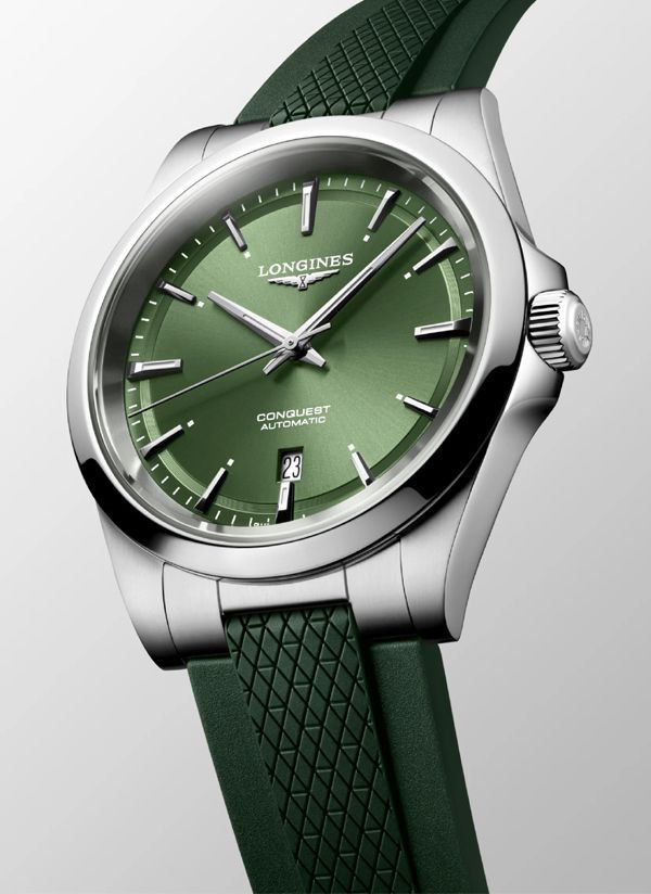 Ten męski zegarek mechaniczny Longines Conquest L3.830.4.02.9 na zielonym pasku kauczukowym to idealna propozycja dla nowoczesnych mężczyzn lubiących klasyczną elegancję ze sportowym sznytem. Na zielonejj tarczy zdobionej słonecznym szlifem idealnie kontrastują polerowane wskazówki w kolorze srebrnym.