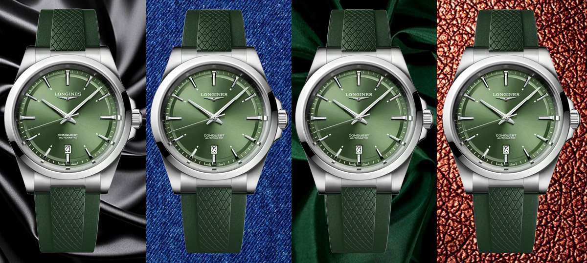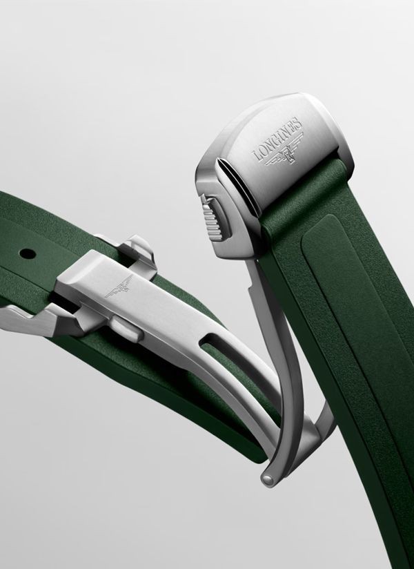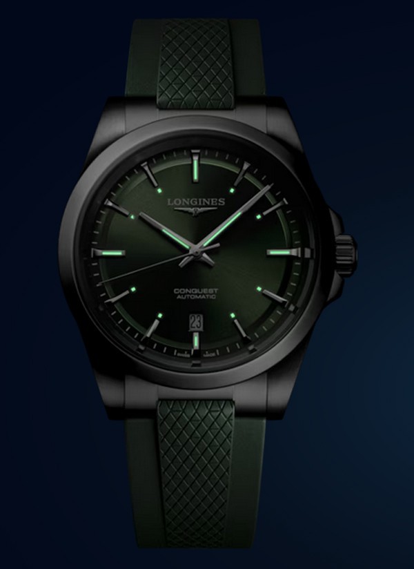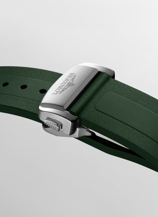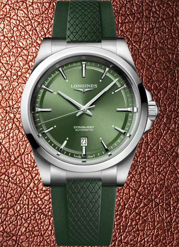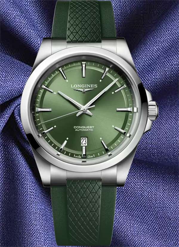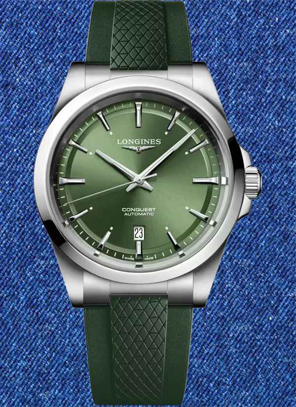 Ten męski zegarek mechaniczny Longines Conquest L3.830.4.02.9 na zielonym pasku kauczukowym to idealna propozycja dla nowoczesnych mężczyzn lubiących klasyczną elegancję ze sportowym sznytem. Na zielonejj tarczy zdobionej słonecznym szlifem idealnie kontrastują polerowane wskazówki w kolorze srebrnym.