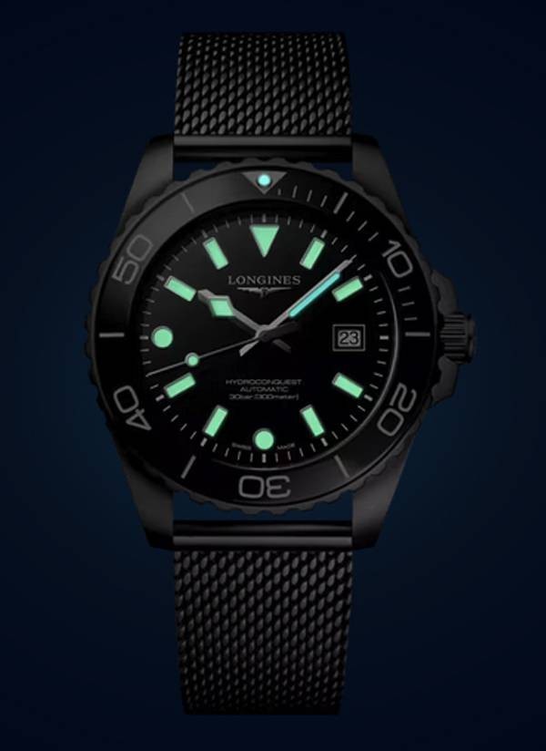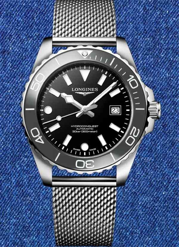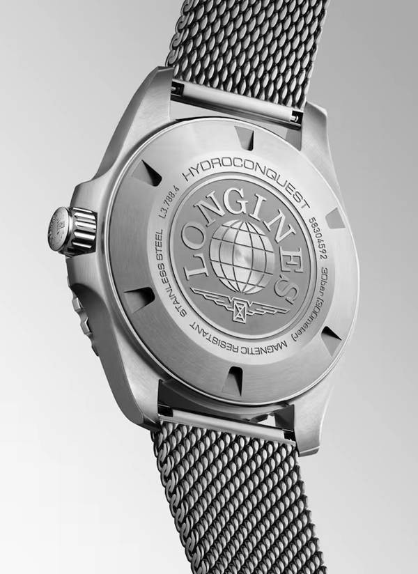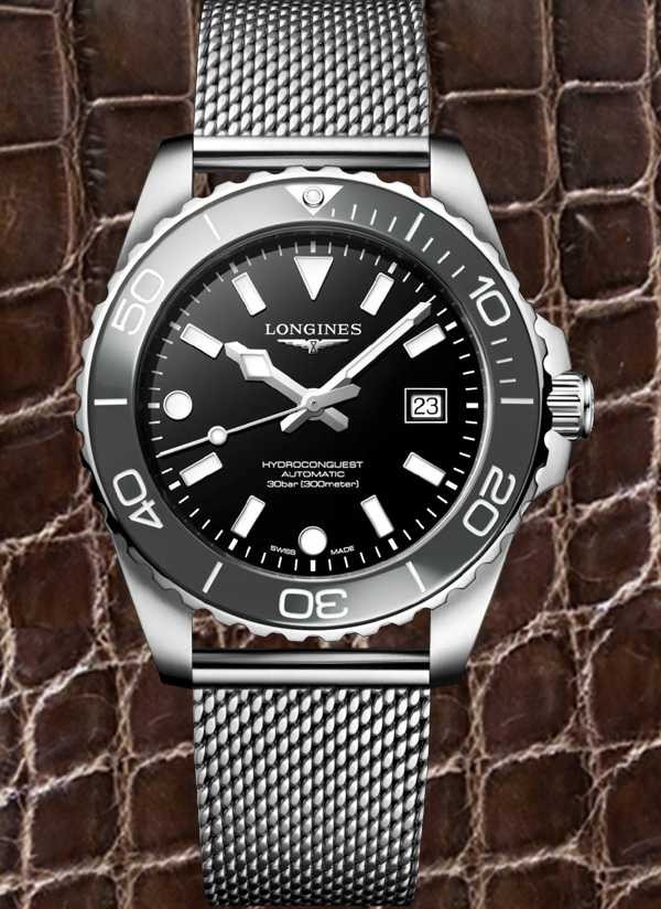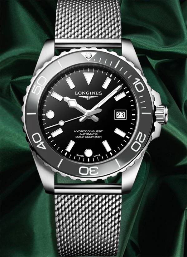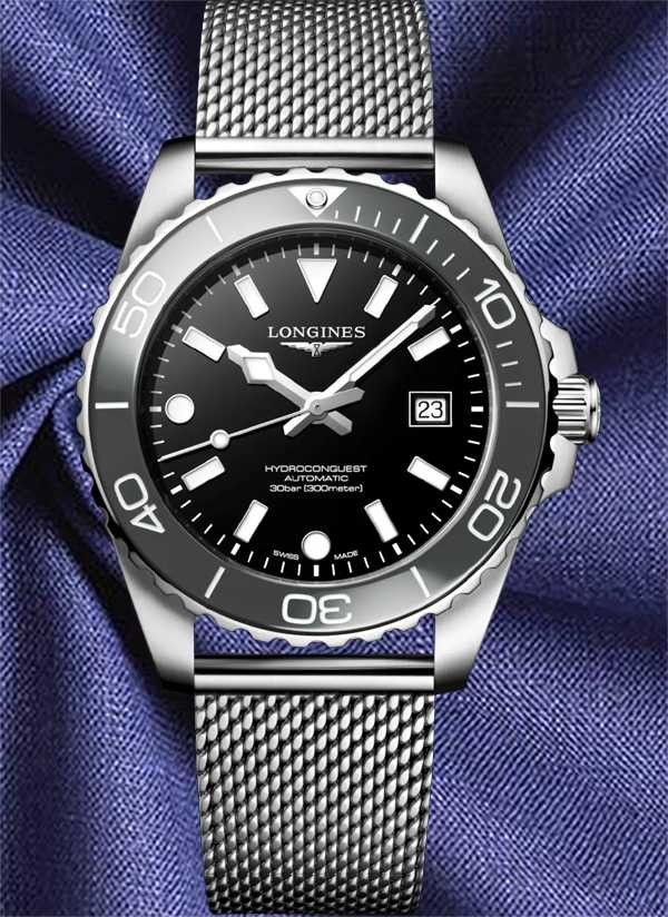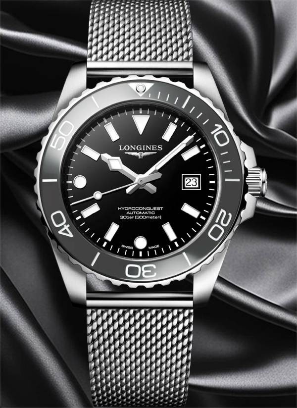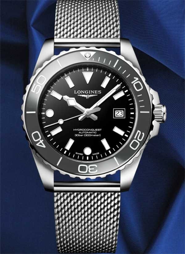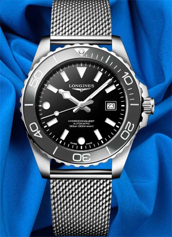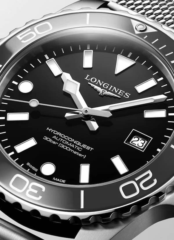 Kolekcja HYDROCONQUEST łączy w sobie nowoczesną estetykę ze sprawdzoną wydajnością. Napędzany ekskluzywnym automatycznym mechanizmem LONGINES, wodoszczelny do 30 barów (300 m), z bezelem obracającym się w jednym kierunku, zakręcaną koronką i zakręcanym deklem.