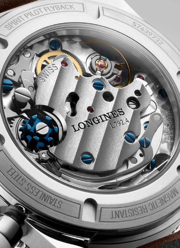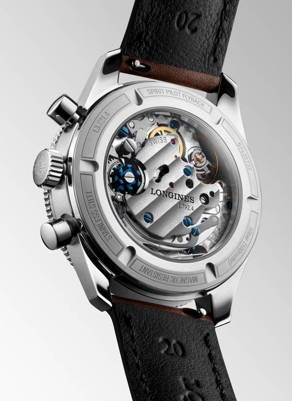 Transparentny dekiel koperty odsłania wszystkie detale mechanizmu, łącznie z wykonanym na wahniku grawerunkiem nazwy Longines Flyback oraz symbolizującym kolekcję Longines Spirit wizerunkiem kuli ziemskiej.