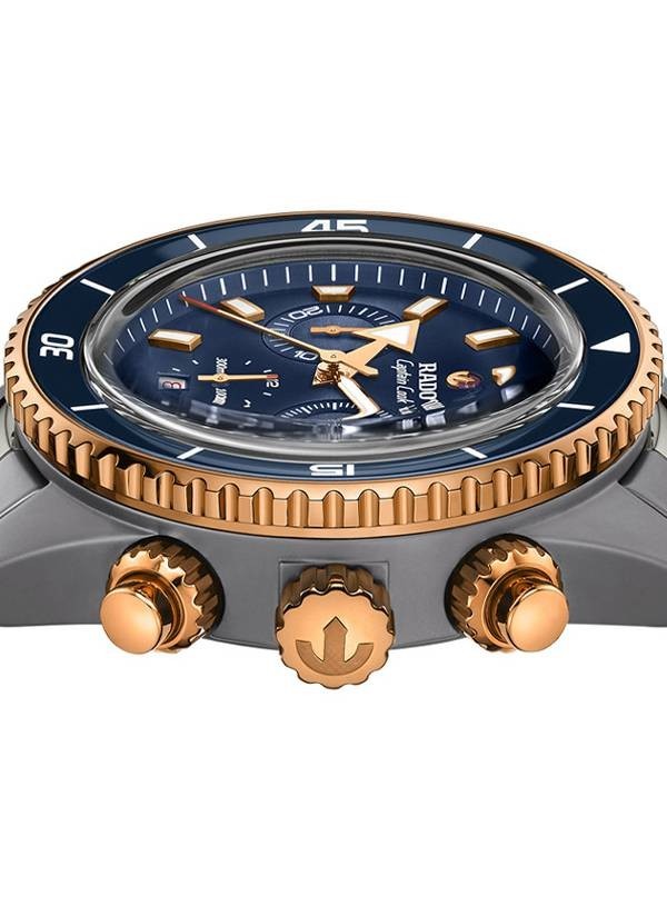 Bezel wykonany ze stali szlachetnej z powłoką PVD w kolorze różowego złota oraz niebieska wkładka