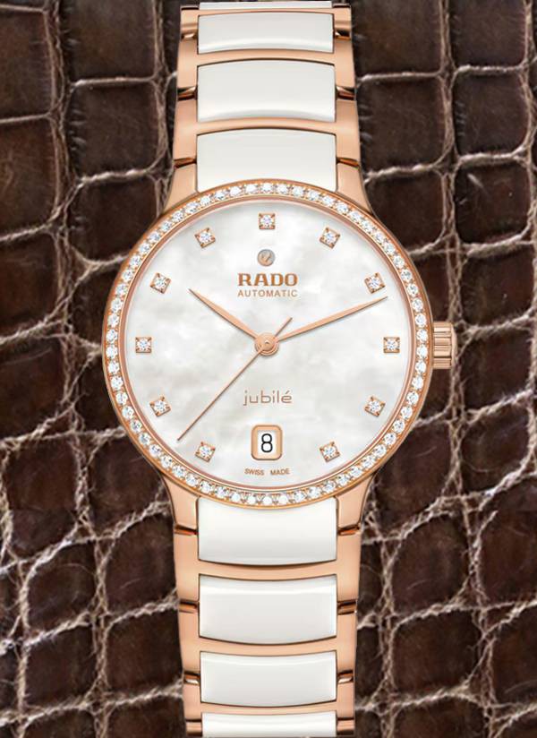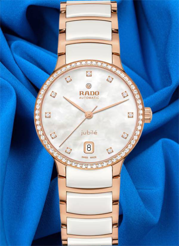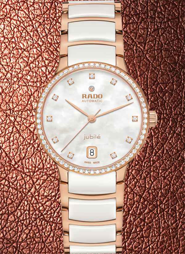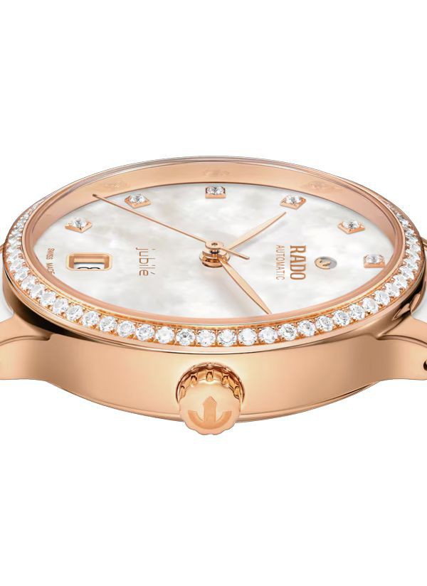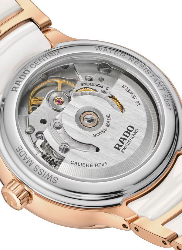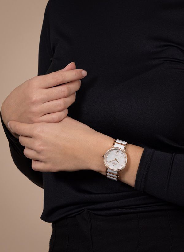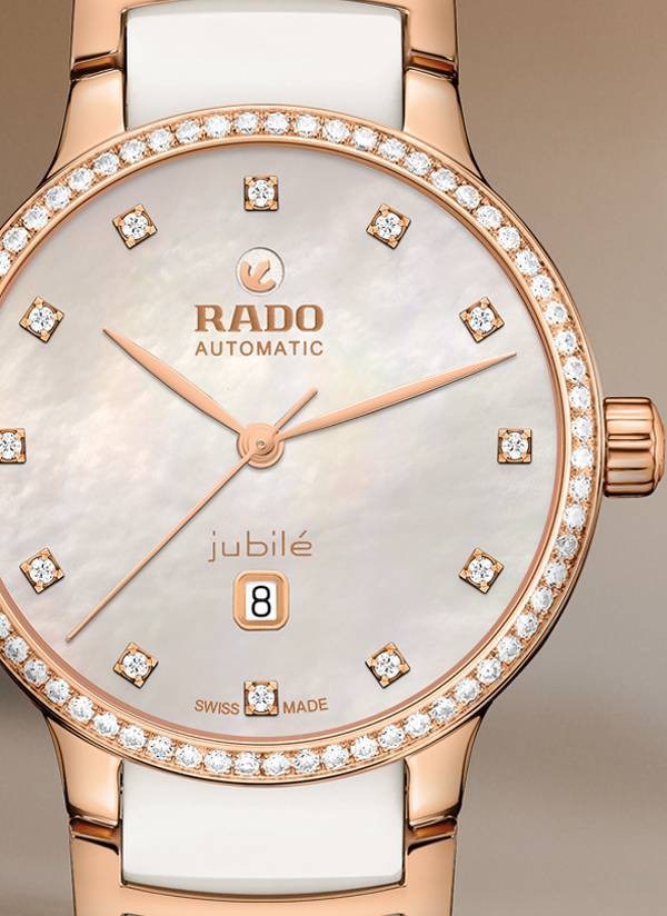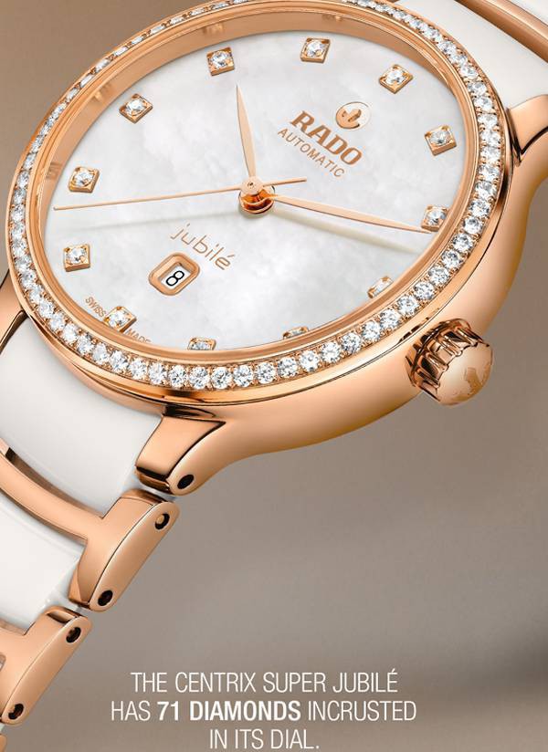 Zegarek Centrix Super Jubile to harmonijne połączenie ekspresji artystycznej i odmienionego designu. Koperta o średnicy 35 mm została wykonana ze stali nierdzewnej w kolorze różowego złota z powłoką PCD. Otacza ją stalowy pierścień tego samego koloru, również z powłoką, wysadzany 60 diamentami Top Wesselton VS-SI o pełnym szlifie brylantowym i zakrzywione szkło szafirowe z powłoką antyrefleksyjną po obu stronach, co zapewnia doskonałą widoczność. Jego sercem, widocznym przez dekiel ze szkła szafirowego, jest precyzyjny kaliber automatyczny R763. Precyzyjnie regulowany w pięciu pozycjach i wyposażony w sprężynę włosową Nivachron™ mechanizm charakteryzuje się wyjątkową dokładnością i solidną 80-godzinną rezerwą chodu. Jasnosrebrna tarcza z masy perłowej jest ozdobiona 11 diamentami Top Wesselton VS-SI o pełnym szlifie brylantowym, które pełnią rolę indeksów, i datownikiem na godzinie 6 – ten zegarek to symbol nieprzemijającej elegancji. Całość tego kultowego czasomierza uzupełniają eleganckie, regulowane mocowania i bransoleta, które zostały wykonane z polerowanej stali nierdzewnej w kolorze różowego złota z powłoką PVD. Środkowe ogniwa powstały z polerowanej plazmowej ceramiki high-tech. Zegarek ma również trzyczęściowe zapięcie ze szczotkowanej stali nierdzewnej.