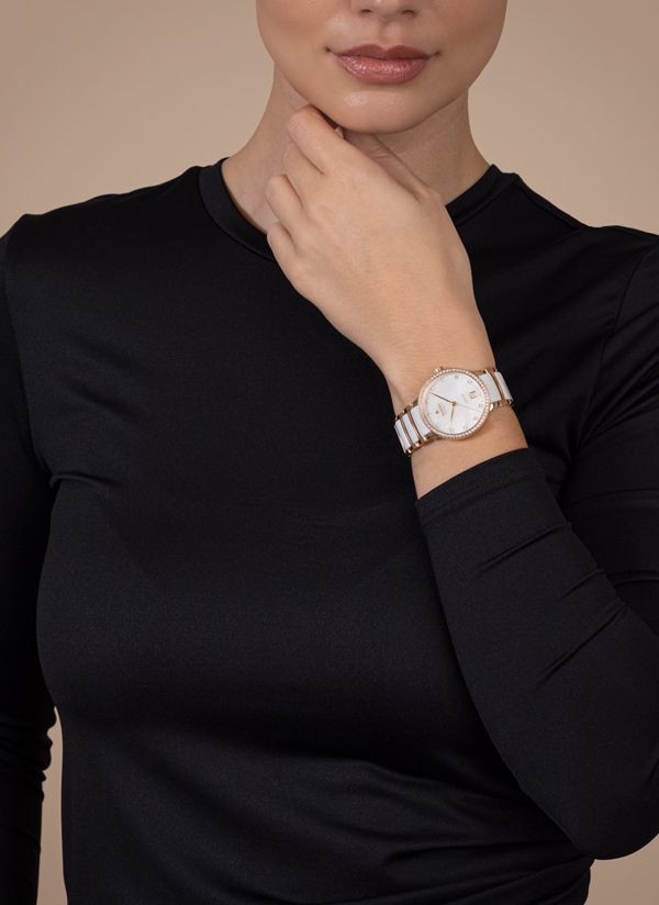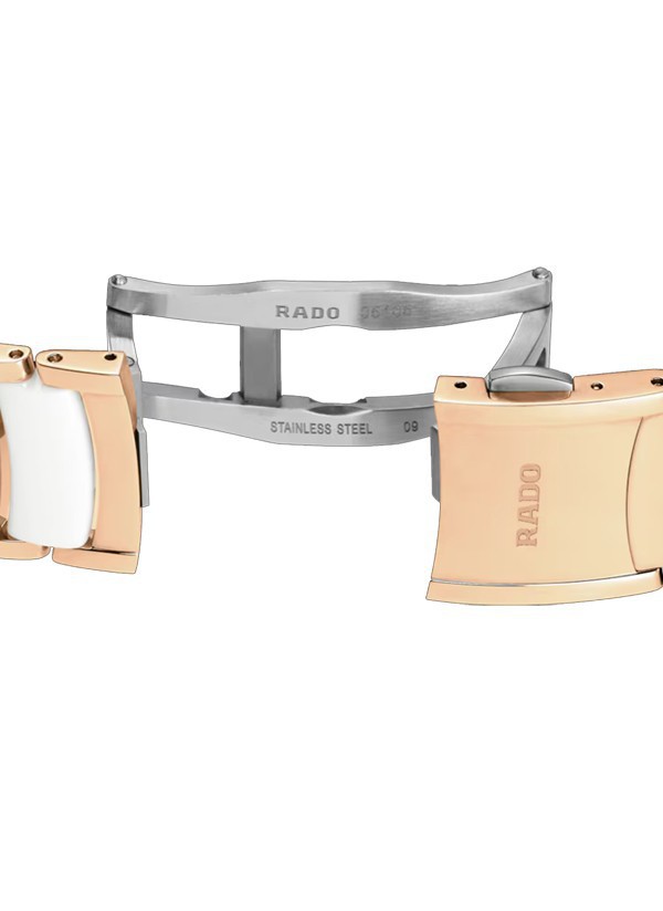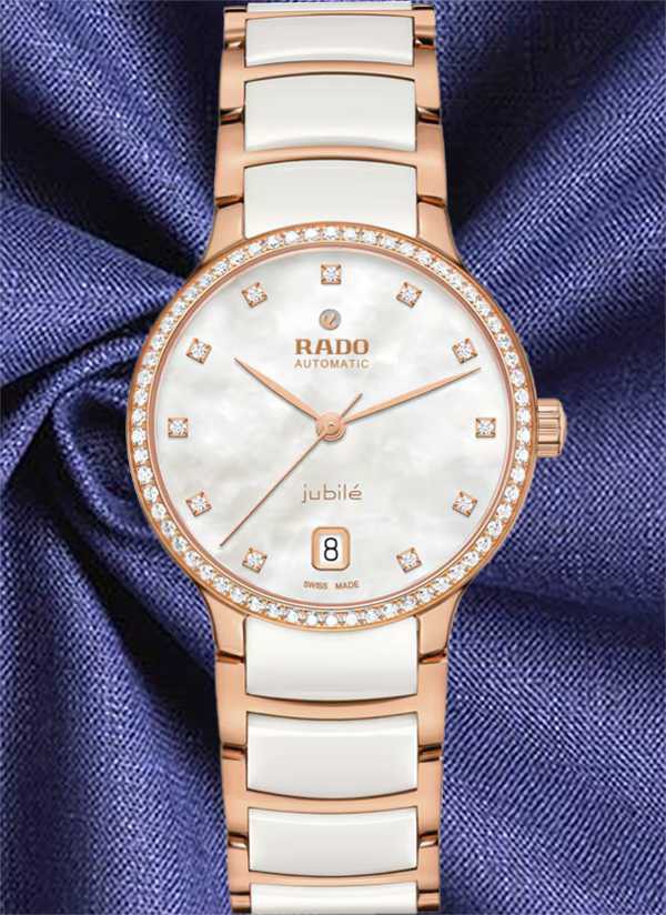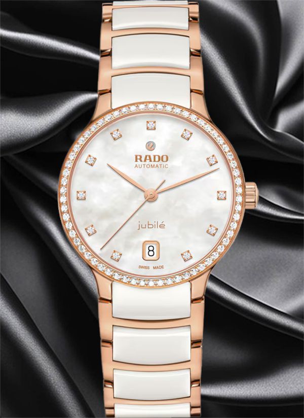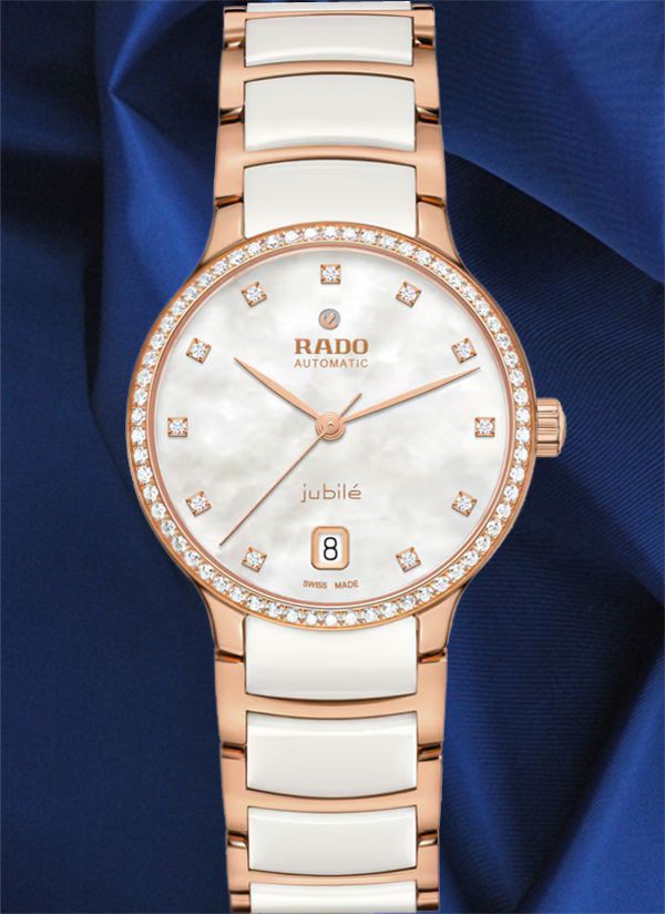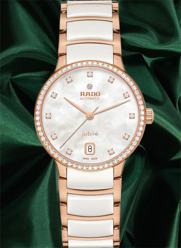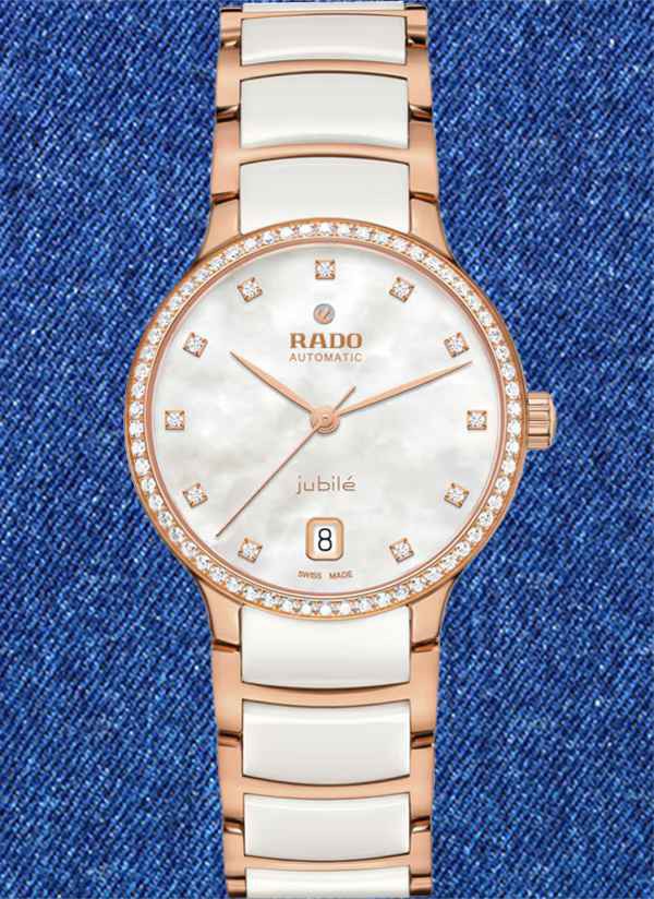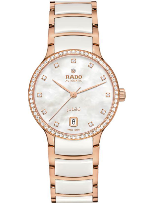 Zegarek Centrix Super Jubile to harmonijne połączenie ekspresji artystycznej i odmienionego designu. Koperta o średnicy 35 mm została wykonana ze stali nierdzewnej w kolorze różowego złota z powłoką PCD. Otacza ją stalowy pierścień tego samego koloru, również z powłoką, wysadzany 60 diamentami Top Wesselton VS-SI o pełnym szlifie brylantowym i zakrzywione szkło szafirowe z powłoką antyrefleksyjną po obu stronach, co zapewnia doskonałą widoczność. Jego sercem, widocznym przez dekiel ze szkła szafirowego, jest precyzyjny kaliber automatyczny R763. Precyzyjnie regulowany w pięciu pozycjach i wyposażony w sprężynę włosową Nivachron™ mechanizm charakteryzuje się wyjątkową dokładnością i solidną 80-godzinną rezerwą chodu. Jasnosrebrna tarcza z masy perłowej jest ozdobiona 11 diamentami Top Wesselton VS-SI o pełnym szlifie brylantowym, które pełnią rolę indeksów, i datownikiem na godzinie 6 – ten zegarek to symbol nieprzemijającej elegancji. Całość tego kultowego czasomierza uzupełniają eleganckie, regulowane mocowania i bransoleta, które zostały wykonane z polerowanej stali nierdzewnej w kolorze różowego złota z powłoką PVD. Środkowe ogniwa powstały z polerowanej plazmowej ceramiki high-tech. Zegarek ma również trzyczęściowe zapięcie ze szczotkowanej stali nierdzewnej.