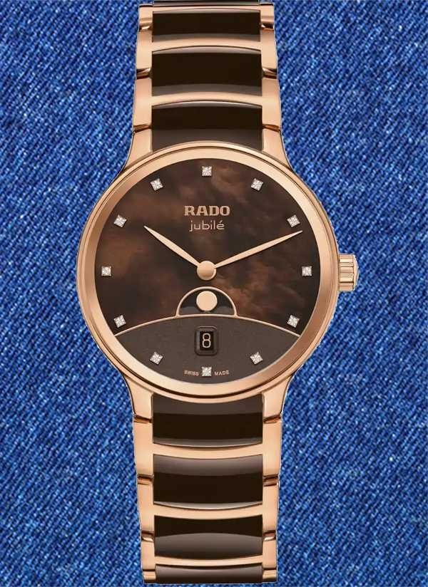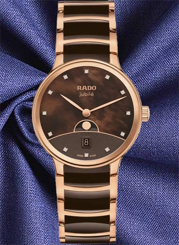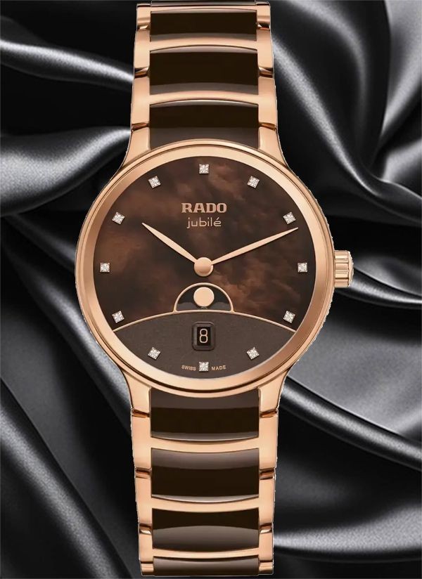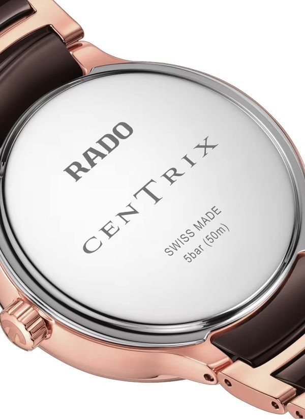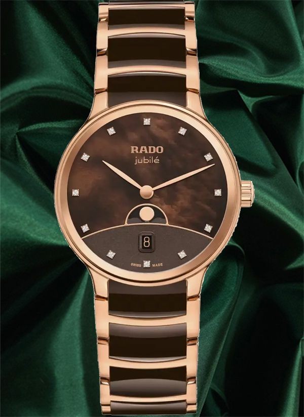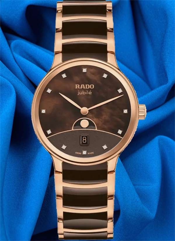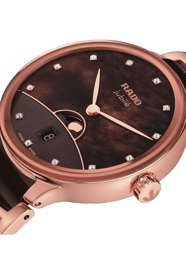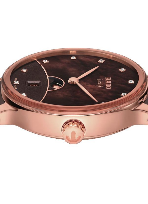 Zegarek Rado Centrix Moonphase precyzyjnie odmierza czas i śledzi cykl księżycowy, stanowiąc ponadczasowe i eleganckie uzupełnienie kolekcji Rado. Zakrzywione szkło szafirowe z podwójną powłoką antyrefleksyjną oraz środkowe ogniwa bransolety z ceramiki high-tech gwarantują trwałość i komfort użytkowania zegarka. Dzięki zaawansowanym materiałom opracowanym przez Rado zegarek przez długi czas zachowuje wygląd jak nowy, podkreślając trwałość i jakość wykonania. Połączenie symboliki ziemi, brązowego nieba z masy perłowej, horyzontu w odcieniu różowego złota oraz fazy Księżyca sprawia, że tarcza zegarka jawi się jako prawdziwe dzieło sztuki. Nakładany Księżyc z polerowanego metalu wyraźnie odcina się na tle tarczy, przyciągając wzrok i podkreślając wyjątkowy charakter zegarka. Całość dopełnia 12 diamentów klasy Top Wesselton (VS–SI), podkreślających luksusowy i biżuteryjny charakter zegarka. Środkowe ogniwa bransolety z brązowej ceramiki high-tech są wyjątkowo przyjemne w dotyku i komfortowo układają się na skórze. Zegarek jest nie tylko wyjątkowo komfortowy w noszeniu, lecz także niezwykle trwały, zaprojektowany z myślą o wieloletnim użytkowaniu. Detale w odcieniu różowego złota subtelnie dopełniają całość, nadając zegarkowi elegancki i wyrafinowany charakter. Ten model z pewnością wyróżni swojego właściciela, podkreślając jego indywidualny styl i wyczucie elegancji. Kwarcowy mechanizm Rado R084 z dwiema wskazówkami, datownikiem oraz wskaźnikiem fazy Księżyca zapewnia wysoką precyzję i niezawodność działania.