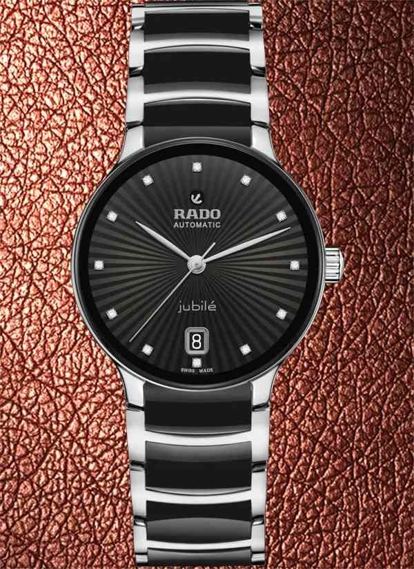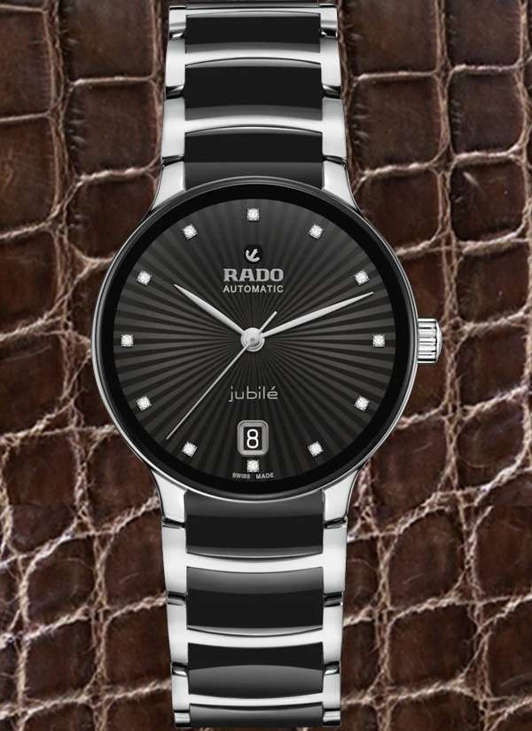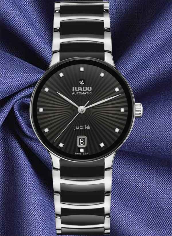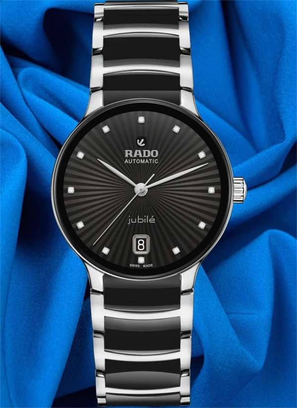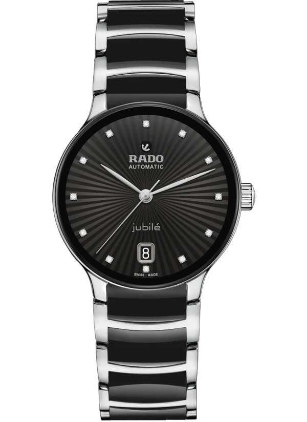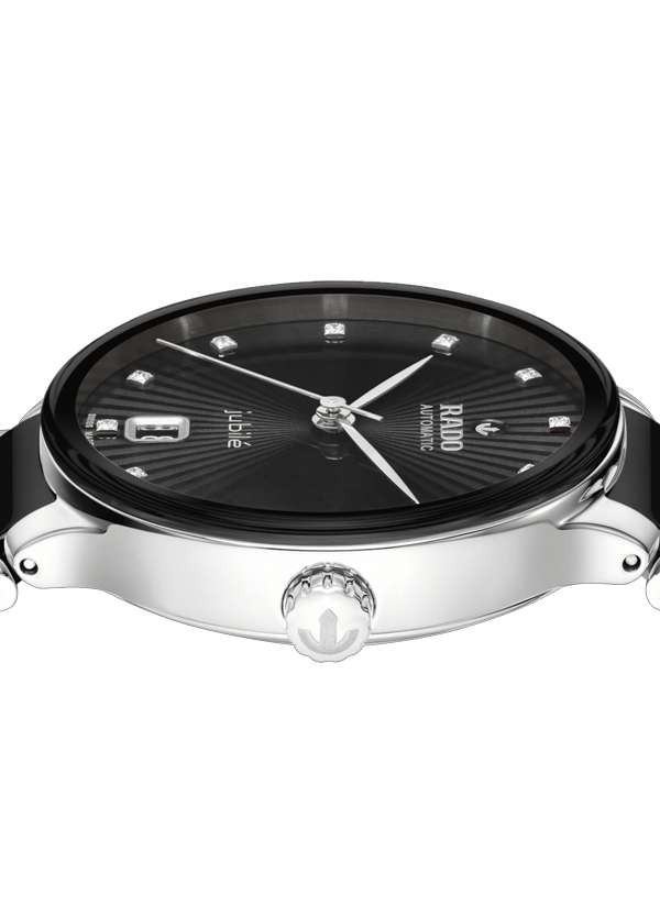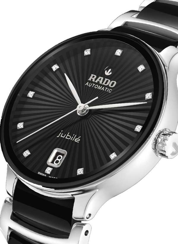 Zegarek Rado Centrix Jubile to harmonijne połączenie ekspresji artystycznej i doskonale dopasowanych elementów wizualnych. Lekko wypukłe szkło szafirowe o zaokrąglonej krawędzi, połączone z kopertą, dopełnia nastrój zegarka, a dzięki powłoce anty-refleksyjnej po obu stronach zapewnia doskonałą czytelność. Wewnątrz znajduje się kaliber R763 z trzema wskazówkami, który przekracza standardowe wymogi testowe już nie o 3, ale o 5 pozycji, dzięki antymagnetycznej sprężynie włosowej Nivachron™ zapewniającej większą niezawodność i dokładność. Regulowane mocowania łączące kopertę z bransoletą i sama bransoleta wykonane z polerowanej stali nierdzewnej z ogniwami z czarnej ceramiki high-tech uzupełniają ogólny wygląd tego kultowego zegarka. Czarna, fasetowana tarcza z 12 brylantami charakteryzuje się ciekawym efektem 3D stworzonym poprzez wytłoczenie uformowanej tarczy, a następnie wypełnienie jej lakierem. Zegarek ten jest wodoodporny do głębokości 50 m i oferuje 80-godzinną rezerwę chodu.