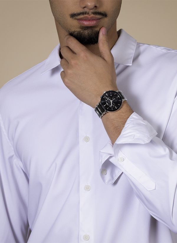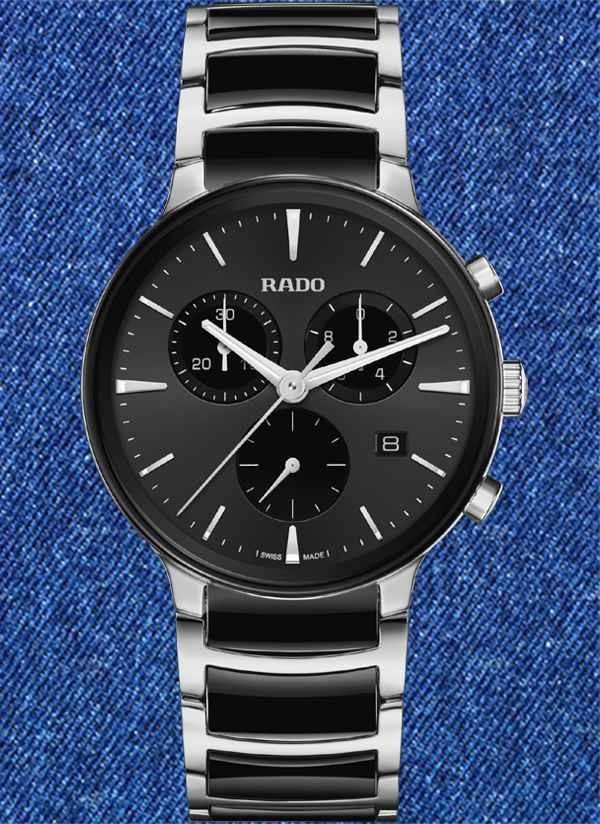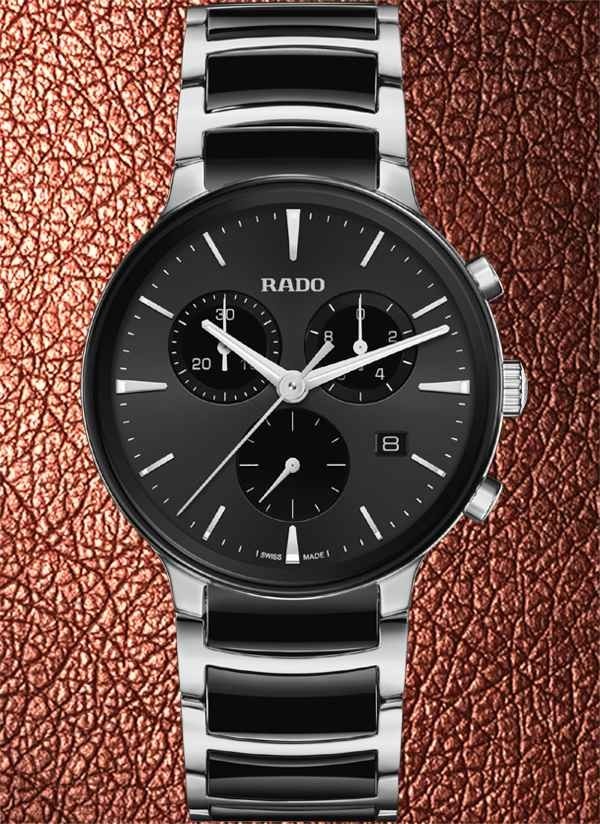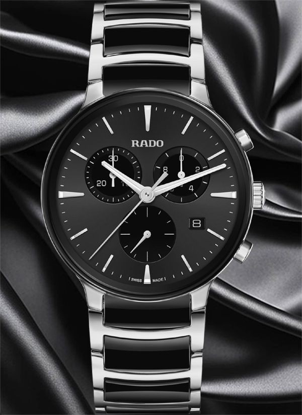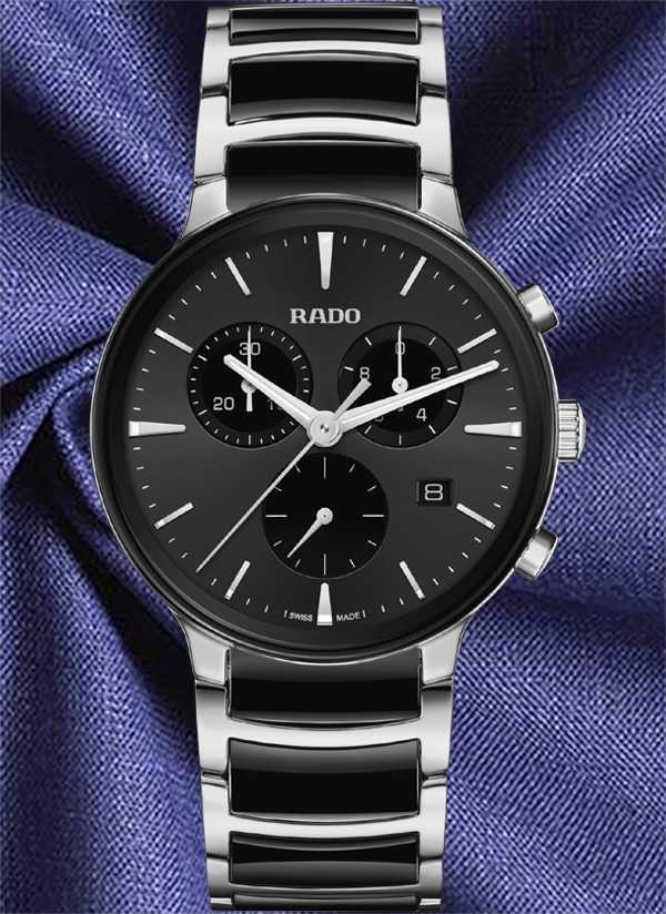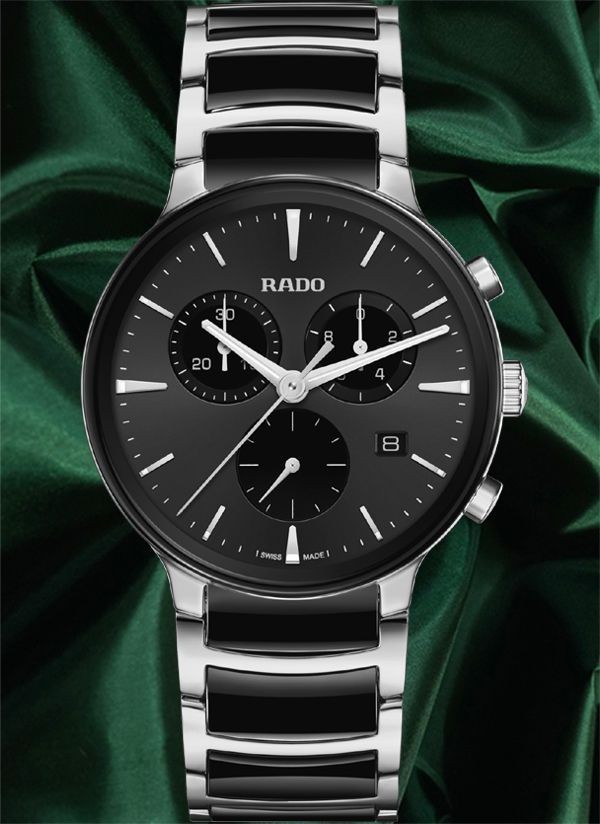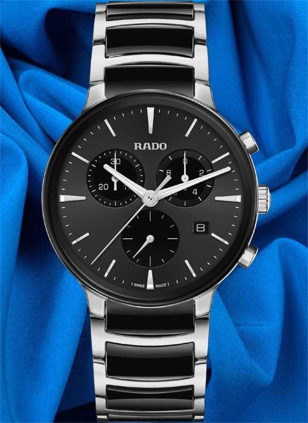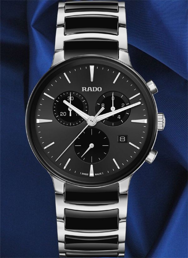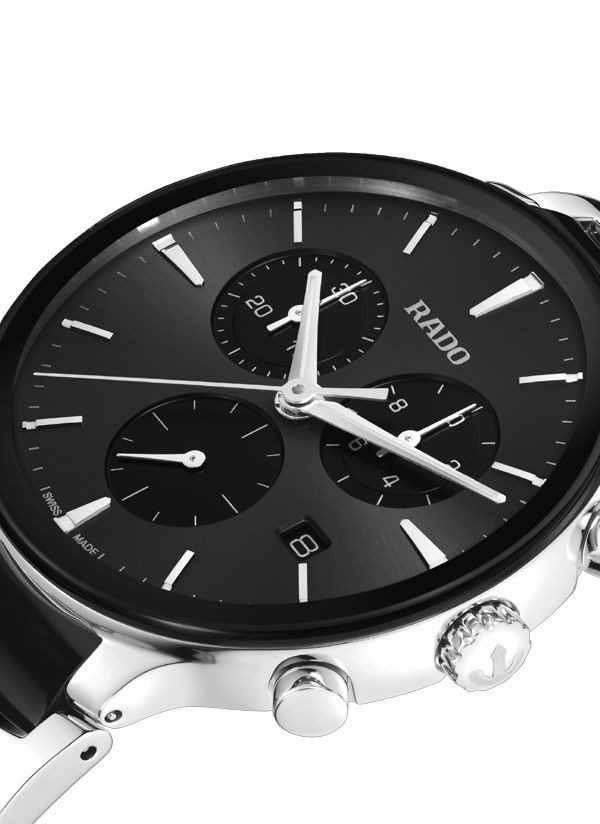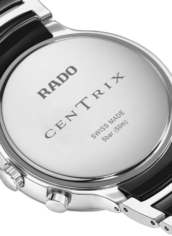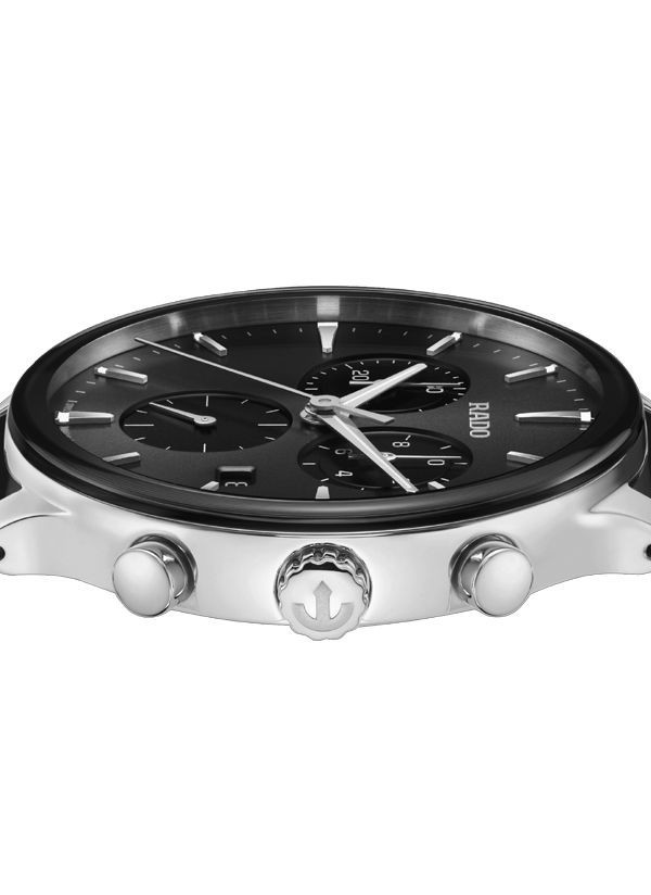 Zegarek Centrix Chronograph to harmonijne połączenie artystycznej ekspresji i eleganckiego wzornictwa. Wykonaną ze stali nierdzewnej kopertę o średnicy 41 mm otacza zakrzywione szkło szafirowe z powłoką antyrefleksyjną po obu stronach, co zapewnia doskonałą widoczność. Sercem zegarka jest kwarcowy chronograf Calibre R312, który wyznacza nowy standard precyzji. Ozdobiony 22 kamieniami mechanizm w konfiguracji z sześcioma wskazówkami łączy w sobie technologie Precidrive i Heavydrive, które stanowią gwarancję niezmiennie najwyższej dokładności wynoszącej +/- 10 sekund na rok. Czarna tarcza ze szlifem słonecznym, ozdobiona nakładanymi rodowanymi indeksami z białą powłoką Super LumiNova®, emanuje wyrafinowaną elegancją. Trzy starannie rozmieszczone liczniki obejmują licznik 30-minutowy, licznik jednej dziesiątej sekundy oferujący precyzyjną funkcjonalność chronografu oraz mały sekundnik przy 6 godzinie. Dyskretny datownik przy godzinie czwartej przydaje odrobiny praktycznego szyku. Całość tego kultowego czasomierza uzupełniają eleganckie, regulowane mocowania i bransoleta, które zostały wykonane z polerowanej stali nierdzewnej. Środkowe ogniwa wykonano z polerowanej ceramiki high-tech koloru czarnego. Zegarek ma również trzyczęściowe zapięcie ze szczotkowanej stali nierdzewnej.