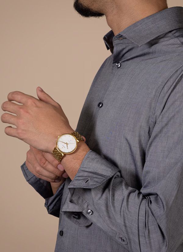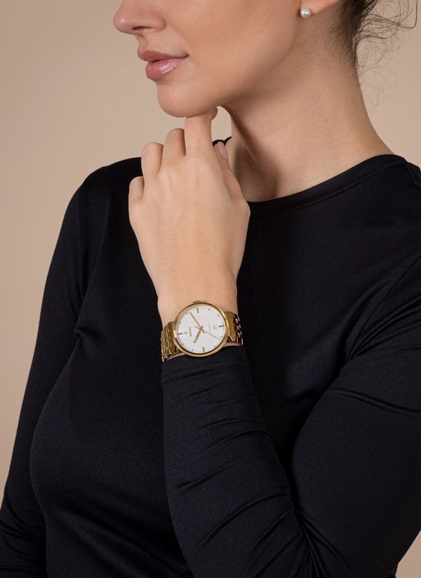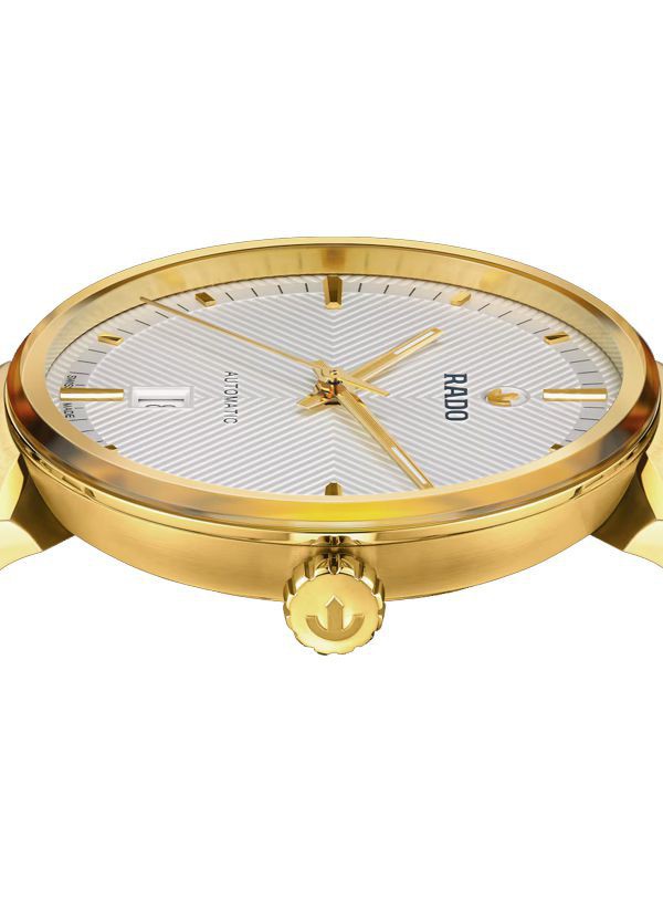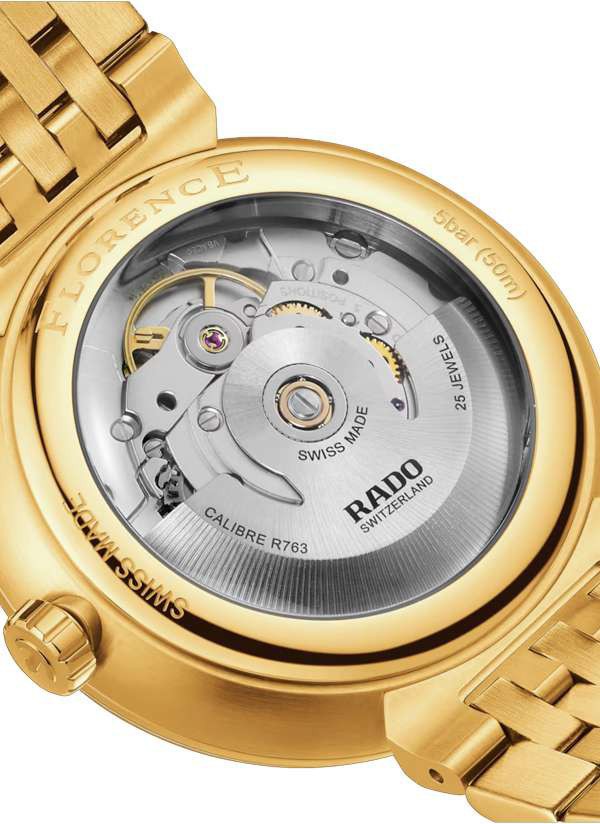 Odkryj ponadczasowe połączenie szwajcarskiej precyzji i elegancji w kultowym zegarku Rado Florence. Kopertę o średnicy 39 mm udekorowano szafirowym szkłem znajdującym się na całej powierzchni, którego metalizowana krawędź współgra z kopertą w kolorze żółtego złota. Szafirowe szkło pełni jednocześnie funkcję ochronnego frontu i pierścienia, jest płynnie zintegrowane z kopertą, podkreślając wyrafinowany, kultowy profil zegarka Florence. Tarcza w kolorze srebrzystej bieli, będąca niczym scena w teatrze, wyróżnia się niezwykłą dbałością o szczegóły dzięki wyrafinowanemu wytłaczanemu wzorowi. Kontrastujące indeksy w kolorze żółtego złota, zwieńczone ruchomym symbolem kotwicy Rado, szczotkowane i polerowane, w sposób hipnotyzujący kontrastują z tłem w kolorze srebrzystej bieli. Kopertę uzupełnia bransoleta ze stali nierdzewnej w kolorze żółtego złota, pokryta powłoką PVD, z szczotkowanymi i polerowanymi ogniwami, zapinana na potrójne zapięcie ze stali nierdzewnej. Pod szafirowym szkłem w kształcie pudełka kryje się dusza zegarka Florence: automatyczny kaliber R763. Precyzyjnie regulowany w pięciu pozycjach i wyposażony w sprężynę włosową Nivachron™ mechanizm ten charakteryzuje się wysoką dokładnością i solidną, 80-godzinną rezerwą chodu, podkreślając zaangażowanie firmy Rado w dążenie do doskonałości.