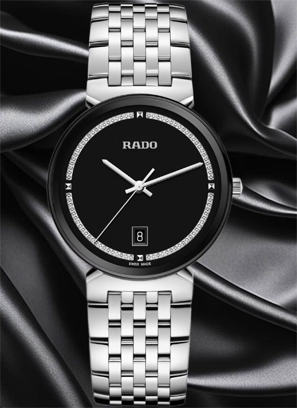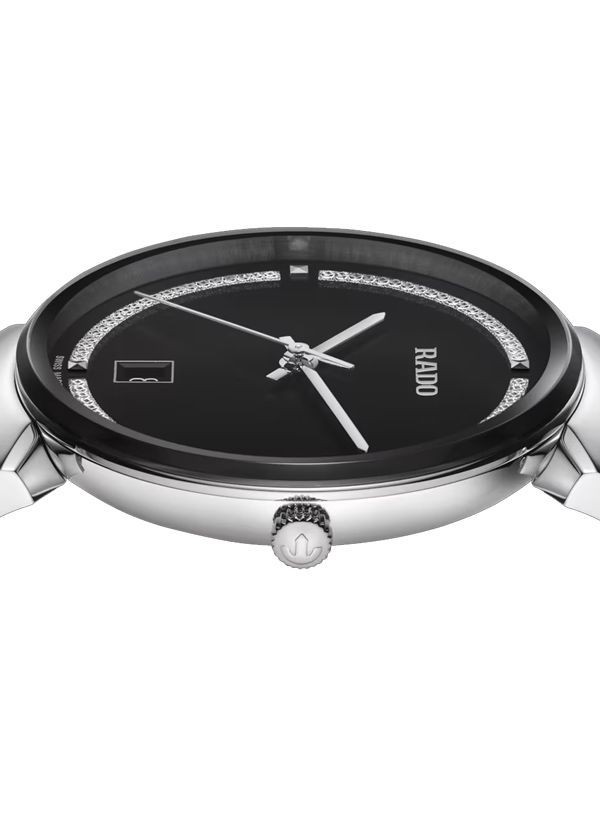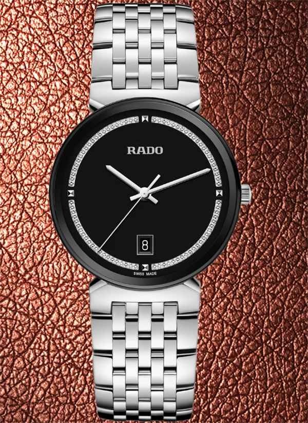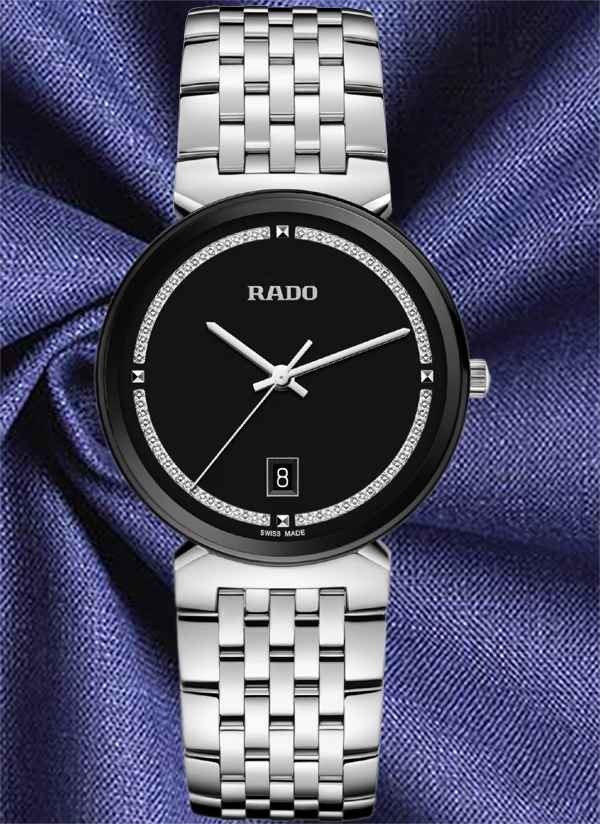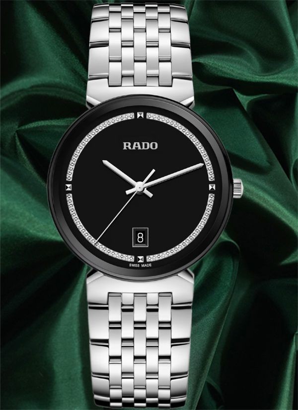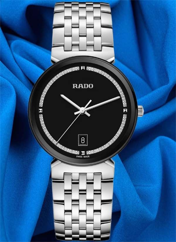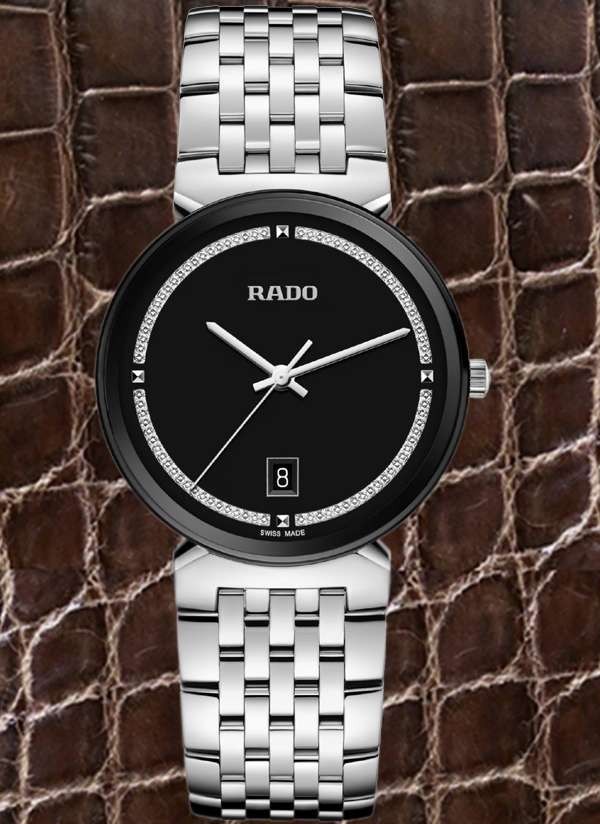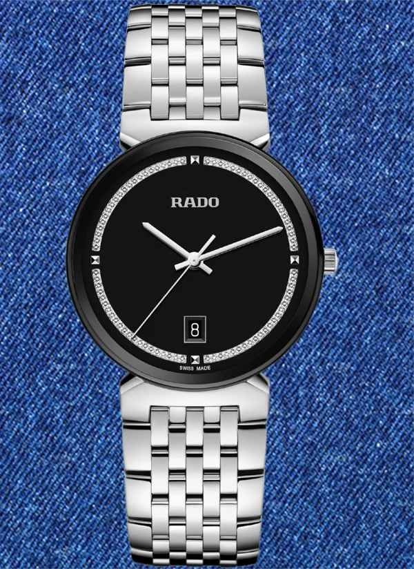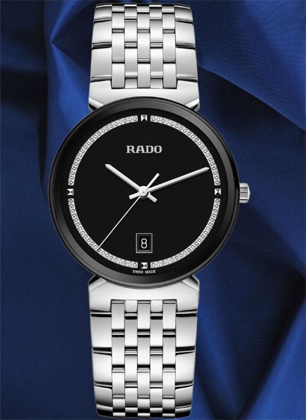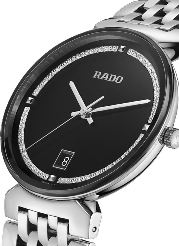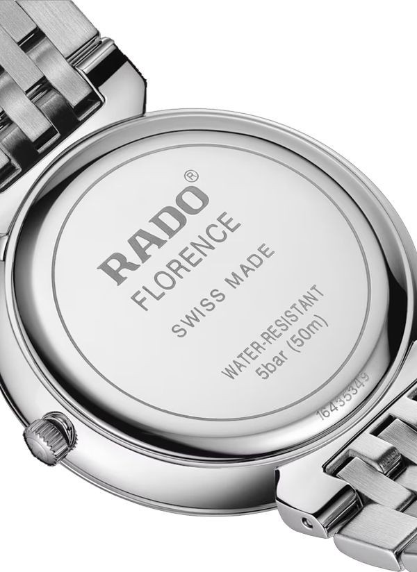 Harmonijne wzornictwo modelu Rado Florence przywodzi na myśl eleganckie kopuły i wieże Florencji, od której kolekcja ta wywodzi swą nazwę. Zegarek ten, napędzany niezawodnym mechanizmem kwarcowym Rado kaliber R073 z trzema wskazówkami, zapewnia zwiększoną dokładność i wytrzymałość na wstrząsy. Zegarek o średnicy 38 mm wyróżnia się fazowanym, zakrzywionym szkłem szafirowym całkowicie pokrywającym kopertę. Jest on wyposażony w kopertę, koronkę, pierścień oraz dekiel z polerowanej stali nierdzewnej. Klasyczną stylistykę zegarka dopełnia bransoleta również wykonana z polerowanej stali nierdzewnej. Czarna tarcza z rodowanymi błyszczącymi zdobieniami, którą dodatkowo podkreśla nadrukowany logotyp „Rado” w kolorze srebrnym, doskonale komponuje się ze wskazówkami o barwie rodu. Zegarek cechuje się wodoszczelnością do głębokości 50 m i jest dostępny także w rozmiarze S, co czyni go idealnym modelem dla par.