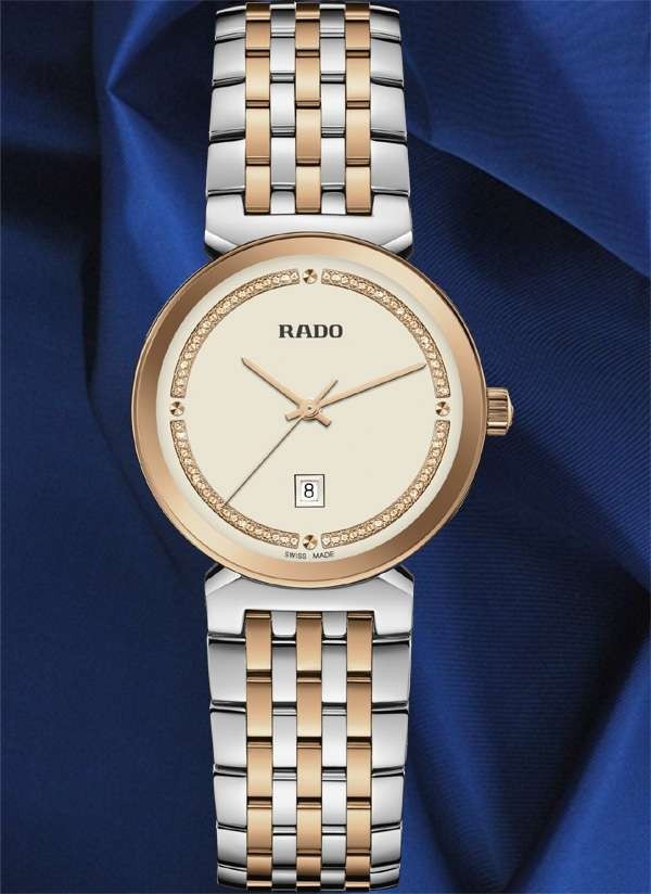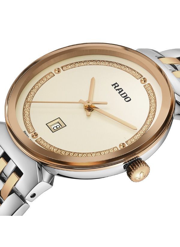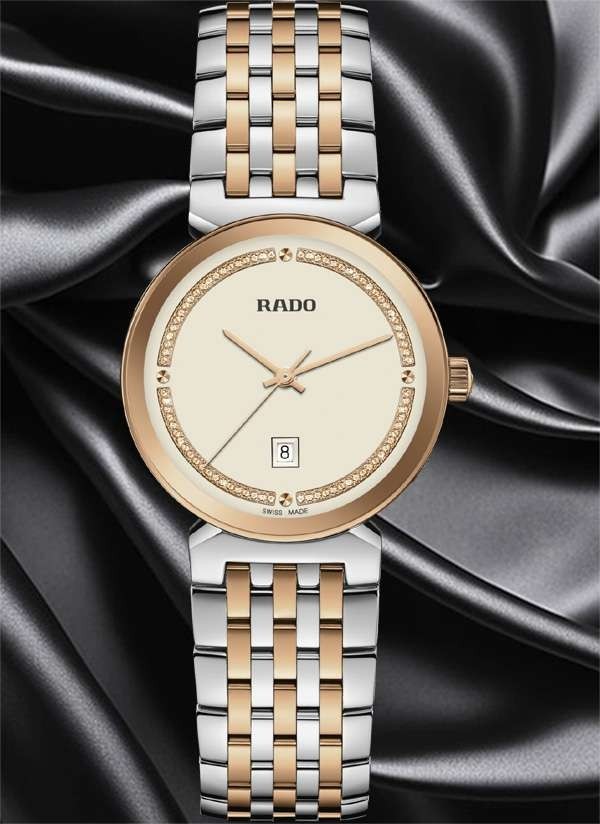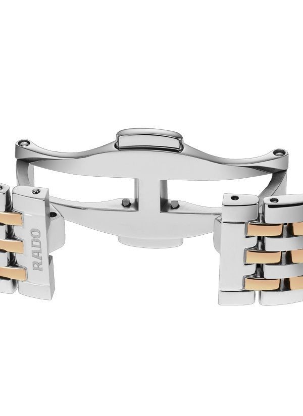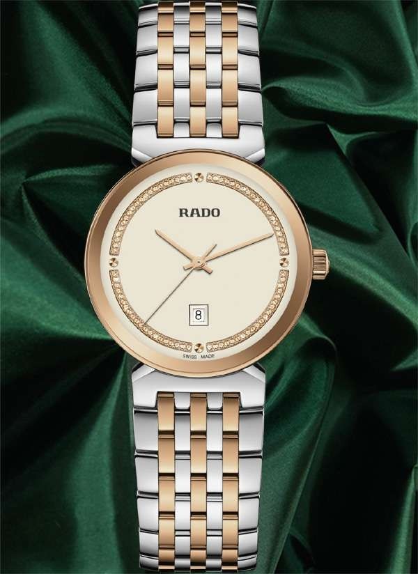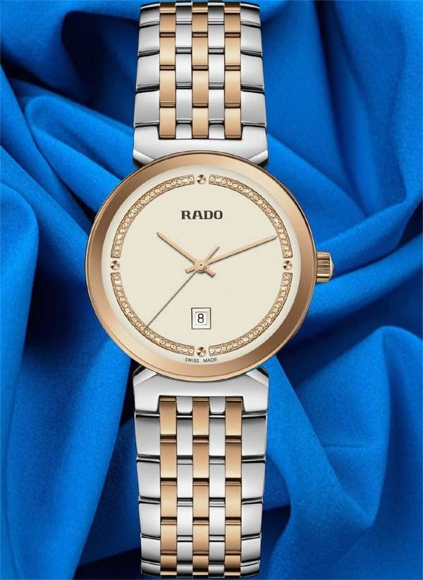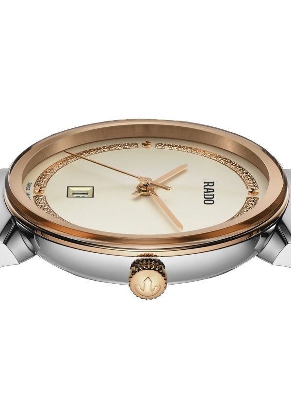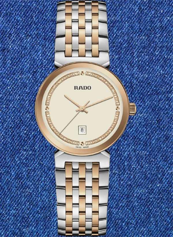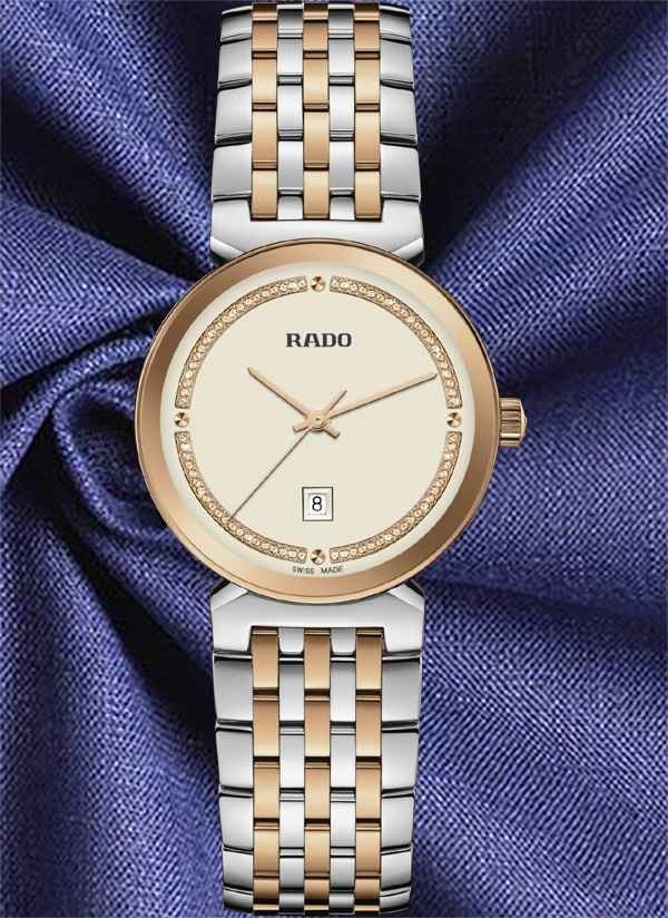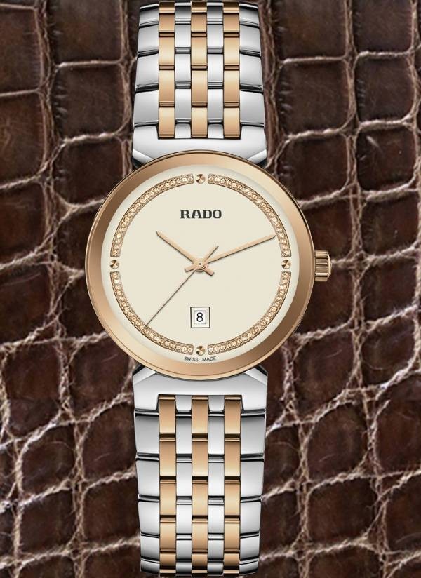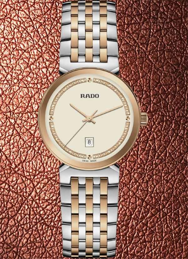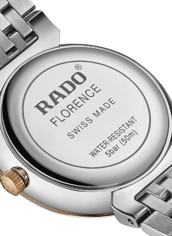Harmonijne wzornictwo modelu Rado Florence przywodzi na myśl eleganckie kopuły i wieże Florencji, od której kolekcja ta wywodzi swą nazwę. Zegarek ten, napędzany niezawodnym mechanizmem kwarcowym Rado kaliber R079 z trzema wskazówkami, zapewnia zwiększoną dokładność i wytrzymałość na wstrząsy. Zegarek o średnicy 30 mm wyróżnia się fazowanym, zakrzywionym szkłem szafirowym całkowicie pokrywającym kopertę. Jest on wyposażony w kopertę, koronkę, pierścień oraz dekiel z polerowanej stali nierdzewnej. Klasyczną stylistykę tego zegarka dopełnia bransoleta również wykonana z polerowanej stali nierdzewnej, przeplatana środkowymi ogniwami w kolorze różowego złota. Tarcza w kolorze szampańskim z połyskującymi elementami dekoracyjnymi w odcieniu różowego złota oraz akcentem w postaci szarego nadrukowanego logotypu „Rado” doskonale komponuje się ze wskazówkami barwy różowego złota. Zegarek ten cechuje się wodoszczelnością do głębokości 50 m i dostępny jest także w rozmiarze L, co czyni go idealnym modelem dla par.