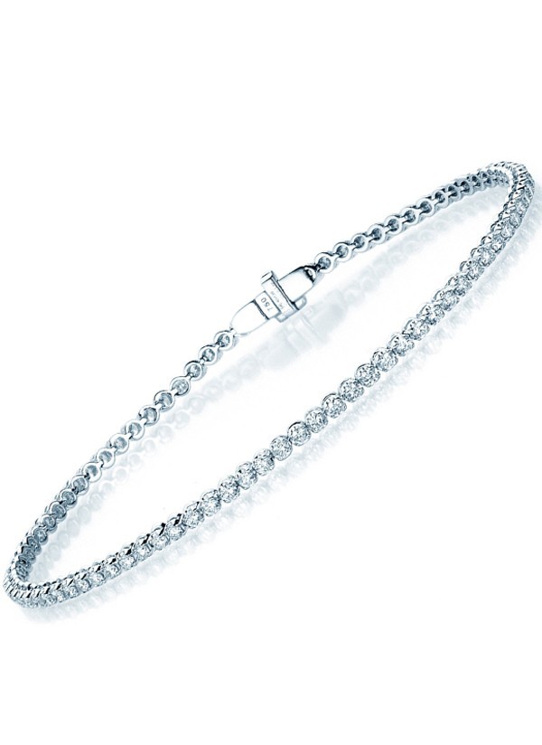 Bransoletka tenisowa składa się z kilkudziesięciu brylantów tej samej masy, czystości i koloru precyzyjnie ułożonych w jednym rzędzie w delikatnej złotej oprawie.