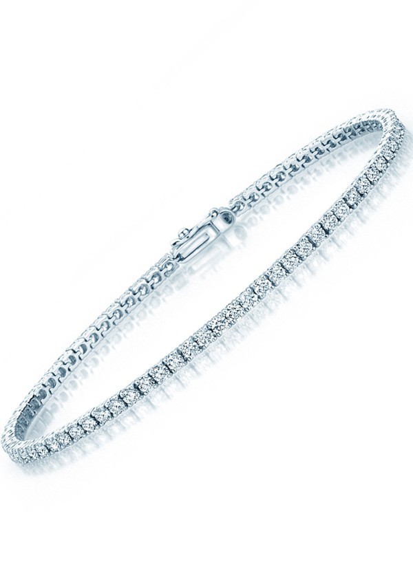 Bransoletka tenisowa składa się z kilkudziesięciu brylantów tej samej masy, czystości i koloru precyzyjnie ułożonych w jednym rzędzie w delikatnej złotej oprawie.