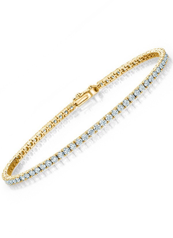 Bransoletka tenisowa składa się z kilkudziesięciu brylantów tej samej masy, czystości i koloru precyzyjnie ułożonych w jednym rzędzie w delikatnej złotej oprawie.