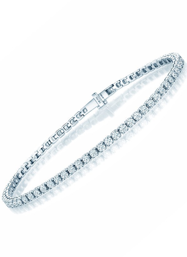 Bransoletka tenisowa składa się z kilkudziesięciu brylantów tej samej masy, czystości i koloru precyzyjnie ułożonych w jednym rzędzie w delikatnej złotej oprawie.